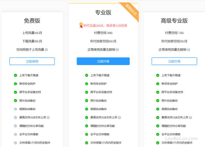 这里我们有看到虽然有基础免费版本,但是基本上做不了什么。如果我们要用免费版本,还不如用前面提到的阿里云盘、百度网盘。坚果云盘个人用的话,建议可以选择专业版。30GB存储,不限制流量,还是够用我们日常需要的。我们可以看到支持跨平台设备、支持最高5GB文件,比如我们用来备份镜像用的比较好。