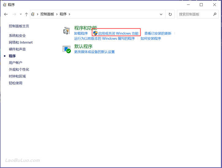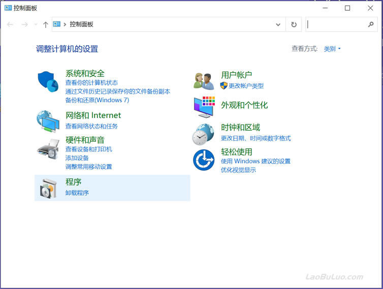 打开Win10控制面板。一般情况下是在左下角WIN键,邮件可以看到 「控制面板」菜单。然后看到上图,找到 上图 「程序」。