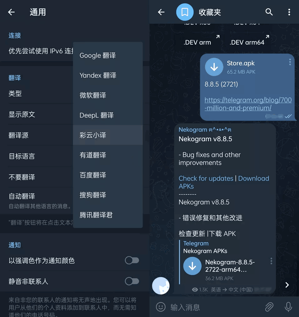 聚合多种翻译引擎,支持翻译消息文章,及对消息自动翻译并显示原文