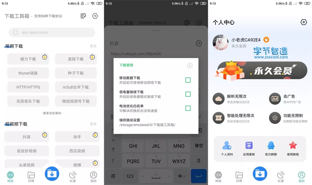 安卓下载工具箱 APP 是一款非常强大的下载工具软件,它支持56种下载协议,下载功能主要分为五类,第一个是常用下载,该分类就有13个工具,包括 CI 力下载、直链下载、种子下载、thuner 下载、M3U8 下载等等,中间三个分类就是视频下载器,支持国内各大热门短视频平台,国外的几个视频网站,国外的需要自己有梯子才行哦,还有一个就是商品视频下载了。