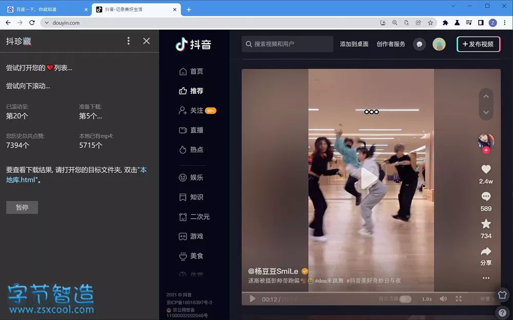 抖珍藏是一款浏览器扩展插件,用来下载抖音点过赞的作品,并可以单独下载某个作者的所有视频。其功能就是将你在抖音点赞❤️的所有作品导出为 mp4 保存,操作简单,易于上手,欢迎需要的朋友下载使用。