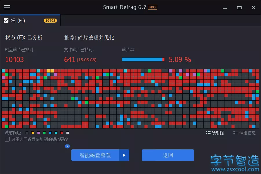 Smart Defrag 拥有一个“安全情报”技术,可以决定何时以及如何执行碎片整理以保证你的硬盘健康。下面是咱亲测的机械硬盘其中一个“房间”堆积垃圾的状况,就是用这款ISD秒分析出来的: