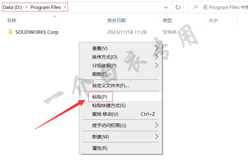 32.打开第17步所设置的安装路径中的【Program Files】文件夹(即D:\Program Files),在打开的文件夹空白处点击右键,将上一步复制的文件夹,粘贴到此文件夹内