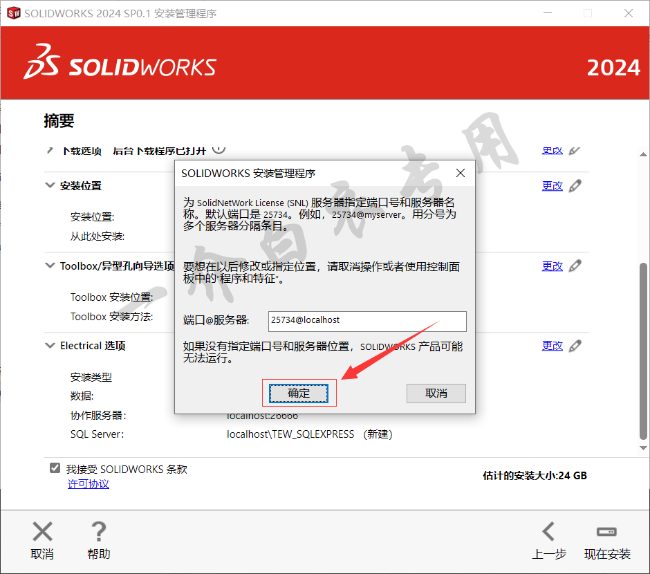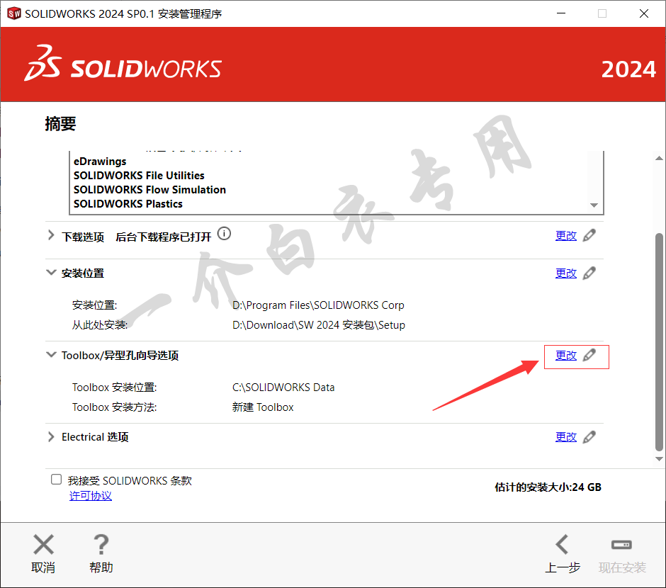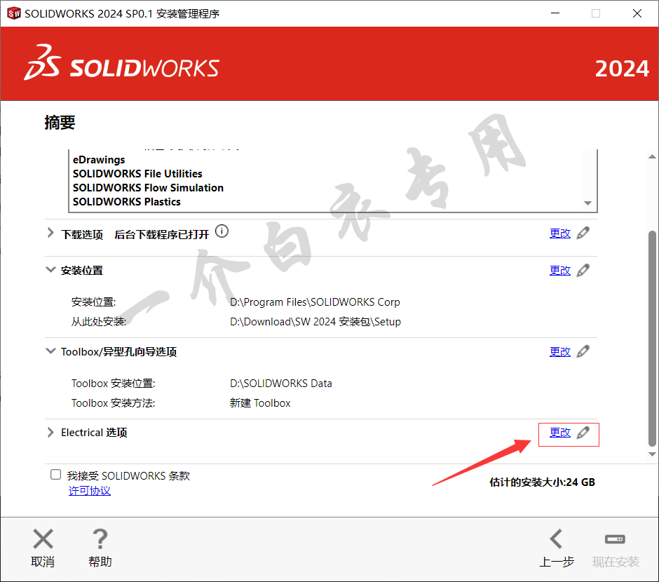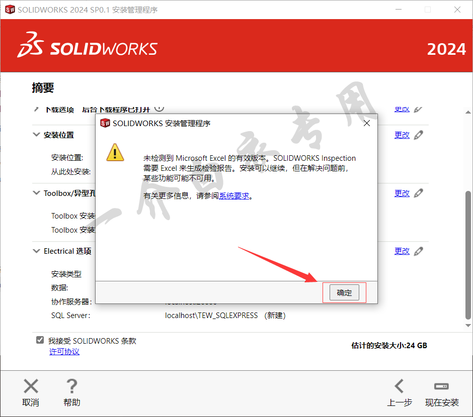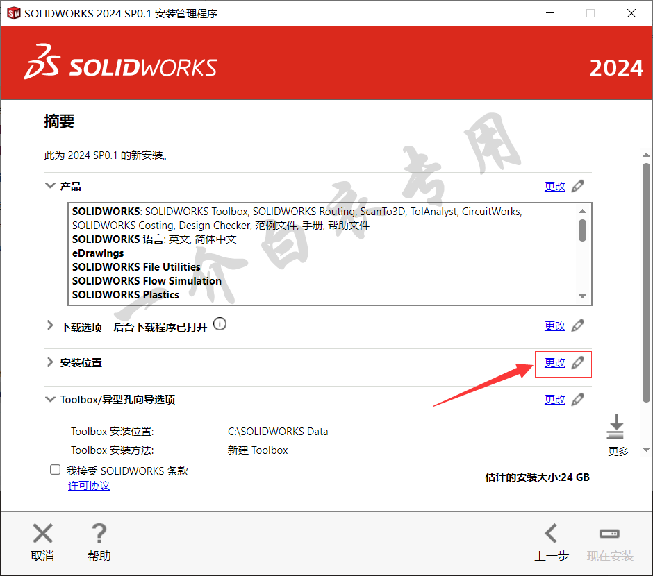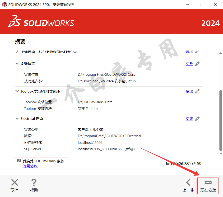 22.勾选【我接受SOLIDWORKS条款】,点击【现在安装】