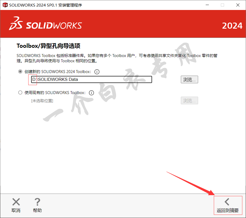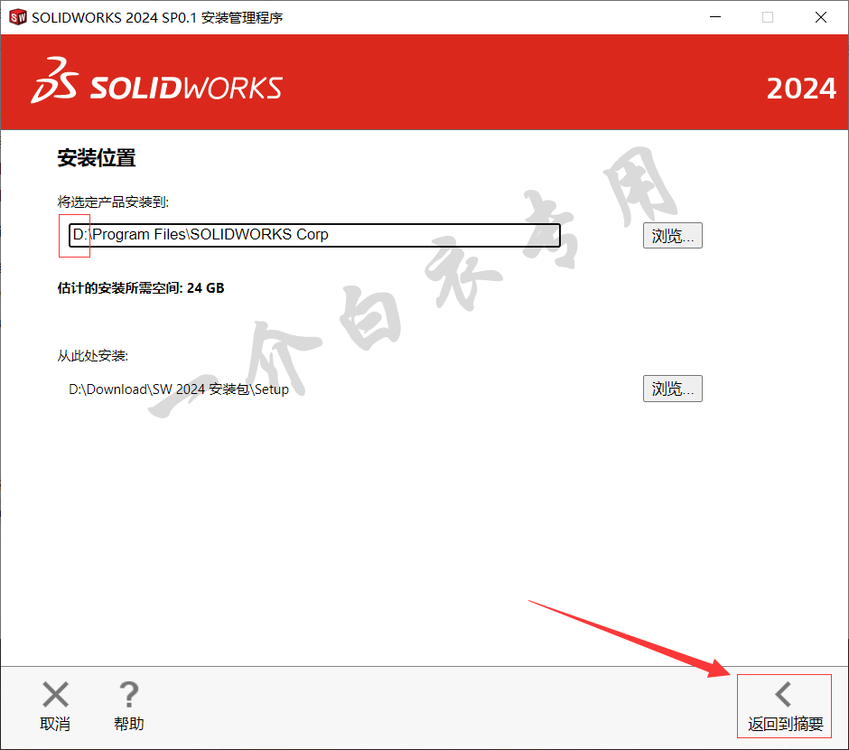 17.将安装路径中的首字母C改为D,表示安装在D盘,然后点击【返回到摘要】