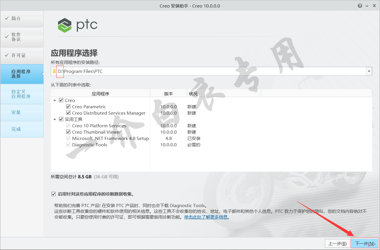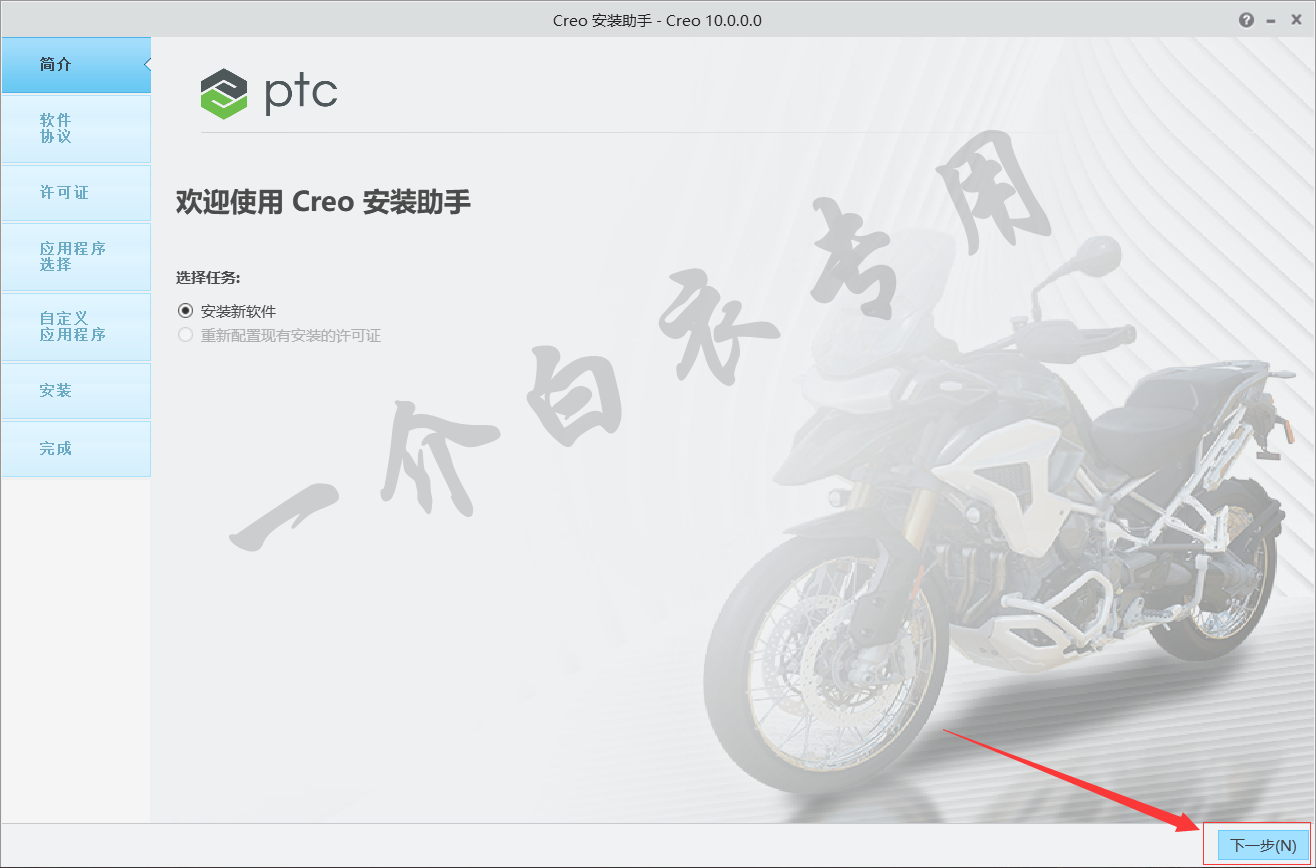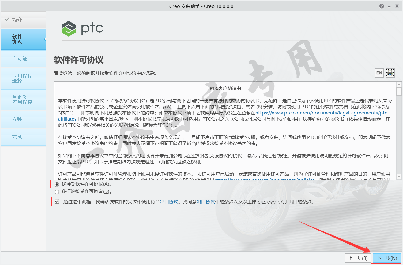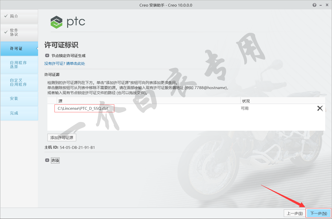18.点击【下一步】(软件会自动载入许可证源,如果没有载入的话,手动添加第8步生成的PTC_D_SSQ.dat文件)