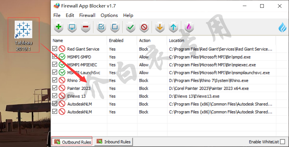 15.点击【Outbound Rules】选卡,将桌面Tableau 2019软件图标拖入到打开的Firewall App Blocker v1.7软件窗口中