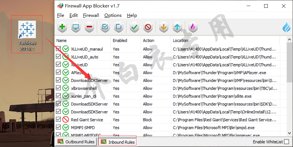 16.切换至【Inbound Rules】选卡,将桌面Tableau 2019软件图标拖入到打开的Firewall App Blocker v1.7软件窗口中