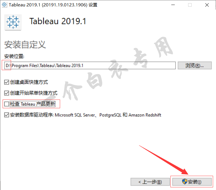 5.将安装路径中的首字母C改为D(表示安装在D盘),取消勾选【检查Tableau产品更新】,然后点击【安装】