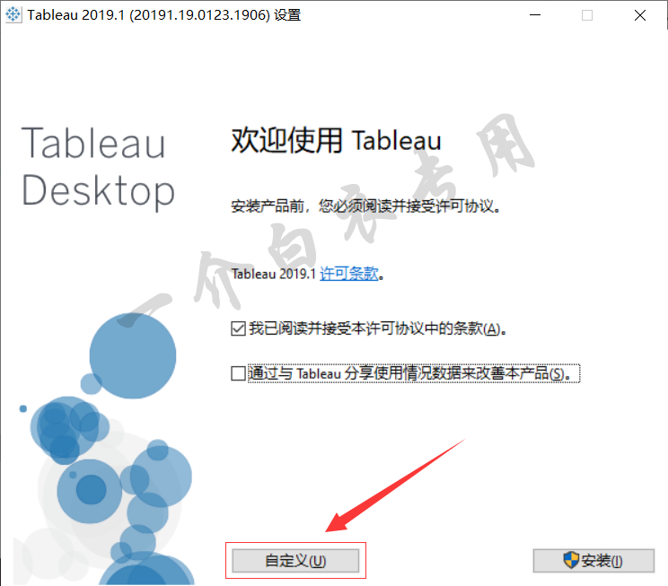 4.勾选【我已阅读并接受本许可协议中的条款】,取消勾选【通过Tableau分享……】,然后点击【自定义】