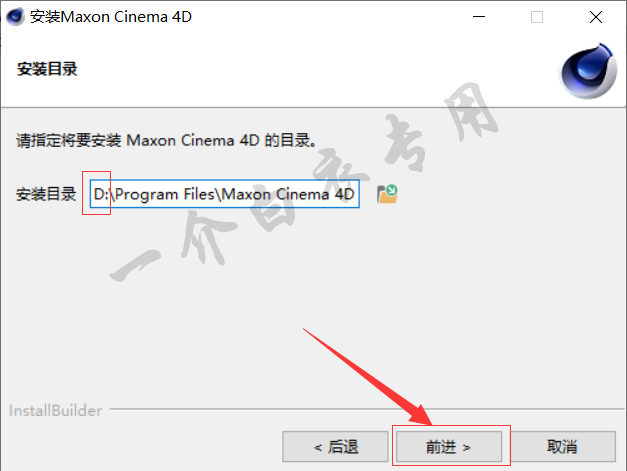5.将安装目录中的首字母C改成D(表示安装在D盘),点击【前进】