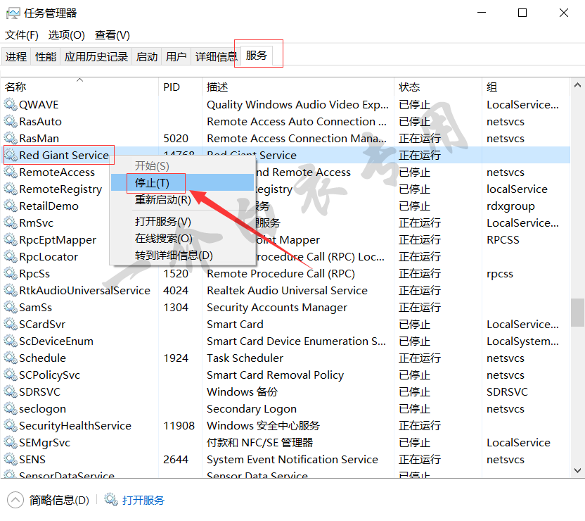 21.切换至【服务】选卡,然后右键点击【Red Giant Service】,选择【停止】(不要关窗此窗口,一会还会用到)