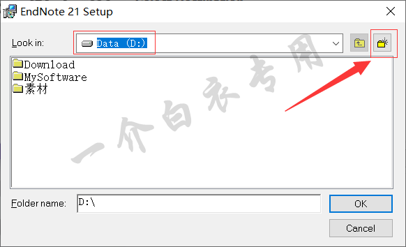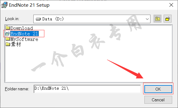 11.将新建的文件夹名称修改为【EndNote 21】并选中,然后点击【OK】
