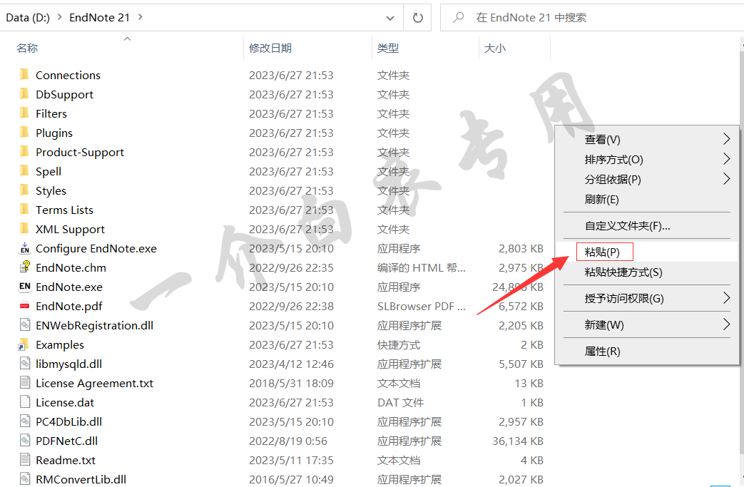 18.打开软件安装目录,即第10步新建的【EndNote 21】文件夹,在文件夹空白处点击右键,将上一步复制的文件粘贴到此文件夹内