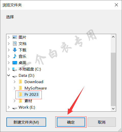 7.将新建的文件夹重命名为【Pr 2023】并选中,点击【确定】