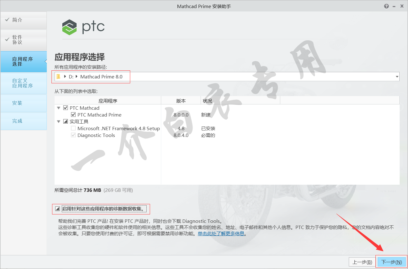 14.修改安装路径为D盘下的【Mathcad Prime 8.0】文件夹,取消勾选【启用针对这些应用程序的诊断数据收集】,然后点击【下一步】