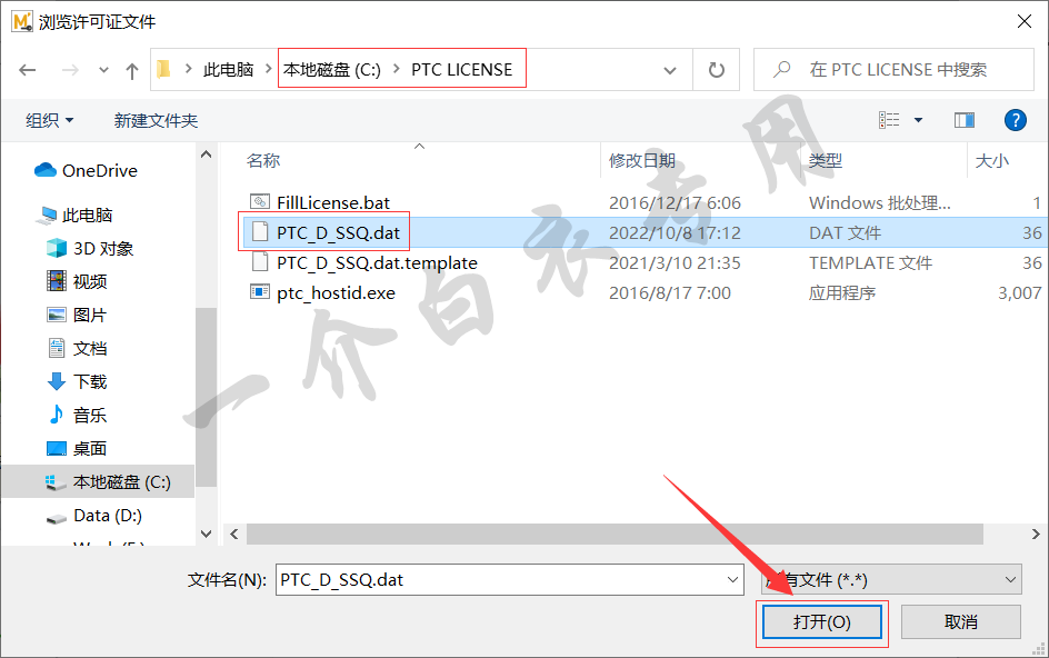 25.定位至C盘【PTC LICENSE】文件夹内的【PTC_D_SSQ.dat】文件,点击【打开】