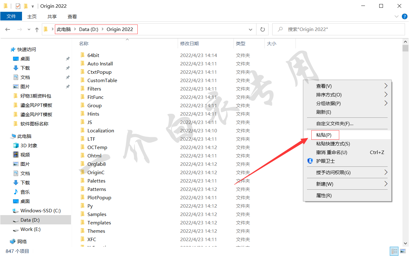 26.然后打开软件的安装位置,即第11步创建的【Origin 2022】文件夹。在文件夹空白处点击右键,将上一步复制的文件粘贴到文件夹内