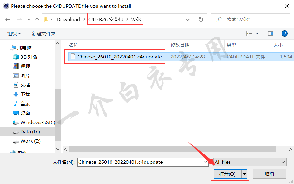 19.在弹出的窗口中,找到第2步打开的【C4D R26 安装包】文件夹中的【汉化】文件夹,并将其打开,然后选中【Chinese_26010_20220401.c4dupdate】文件,点击【打开】