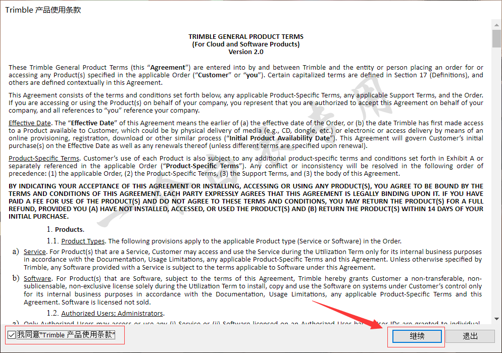 16.勾选【我同意”Trimble”产品使用条款】,然后点击【继续】