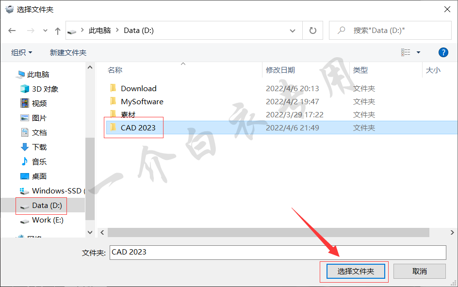 8.选择D盘,然后在空白处点击右键,新建一个文件夹,并将其命名为【CAD 2023】,接着选中此文件夹,然后点击【选择文件夹】