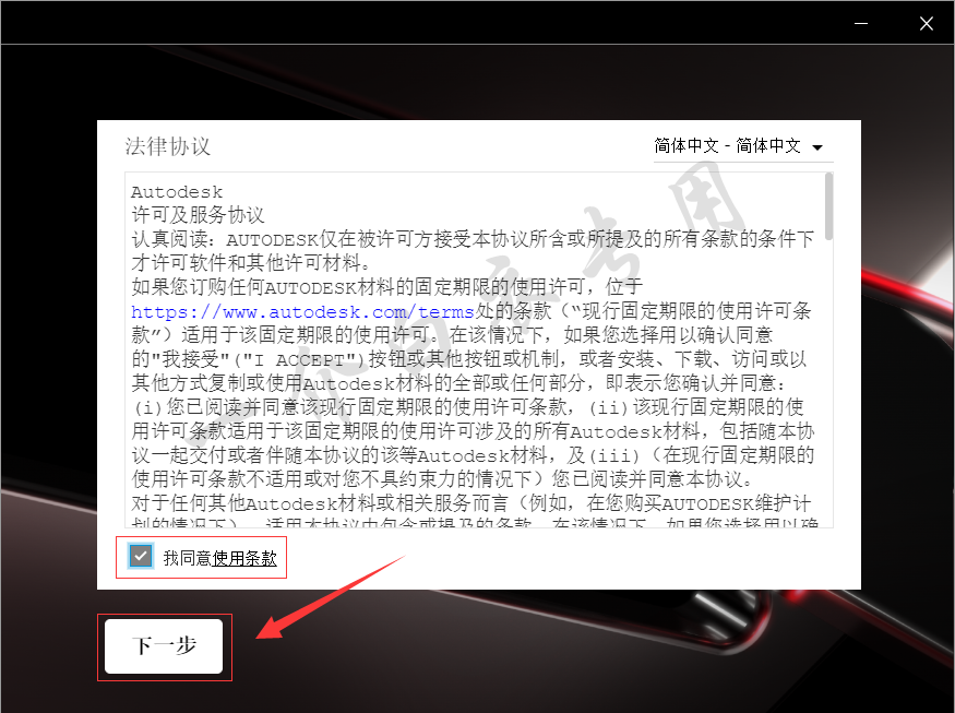 6.勾选【我同意使用条款】,然后点击【下一步】