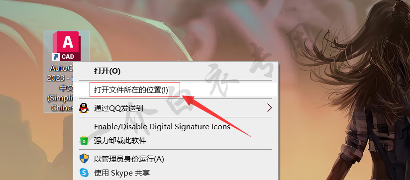 15.返回桌面,选中CAD2023软件图标,然后点击右键,选择【打开文件所在的位置】