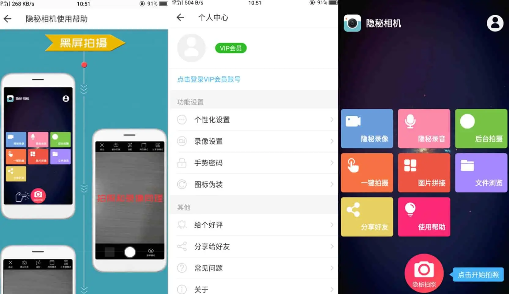 隐秘相机是一款能够将手机变成一台隐形拍摄器,原理就是后台自动拍摄,可设置前置拍摄和后置拍摄,锁屏也能自动无声拍摄,支持一键拍摄、隐秘录音、后台拍摄、图片拼接、文件浏览等功能。