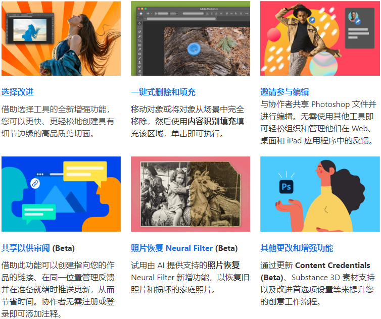 Photoshop 2023 更新带来了选择改进、一键式删除和填充、邀请参与编辑、共享以供审阅 (Beta)、照片恢复 Neural Filter (Beta),以及Substance 3D 素材支持以及改进首选项设置等来提升您的创意工作流程等。
