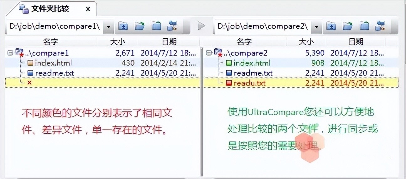 文件比较:UltraCompare 能够比较出任何两份或三份文档的不同,并且通过醒目的标识将差异显示出来。过滤器,同步滚屏,下一例差异跳转等,合理利用这些实用功能能够帮助您更好地找到文件的差异。