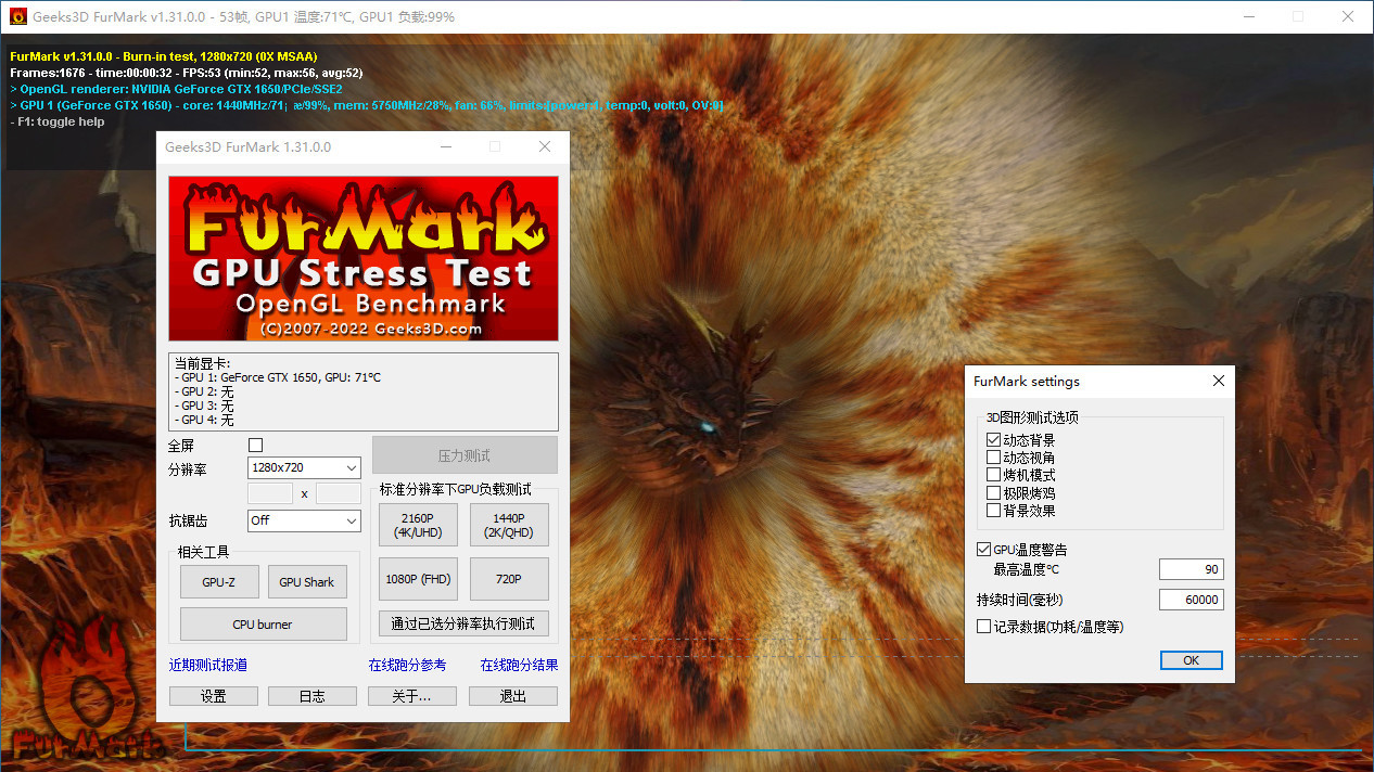 - 测试过程中程序主界面将一直保留,这样需要增加测试项目时便无需重新启动Furmark