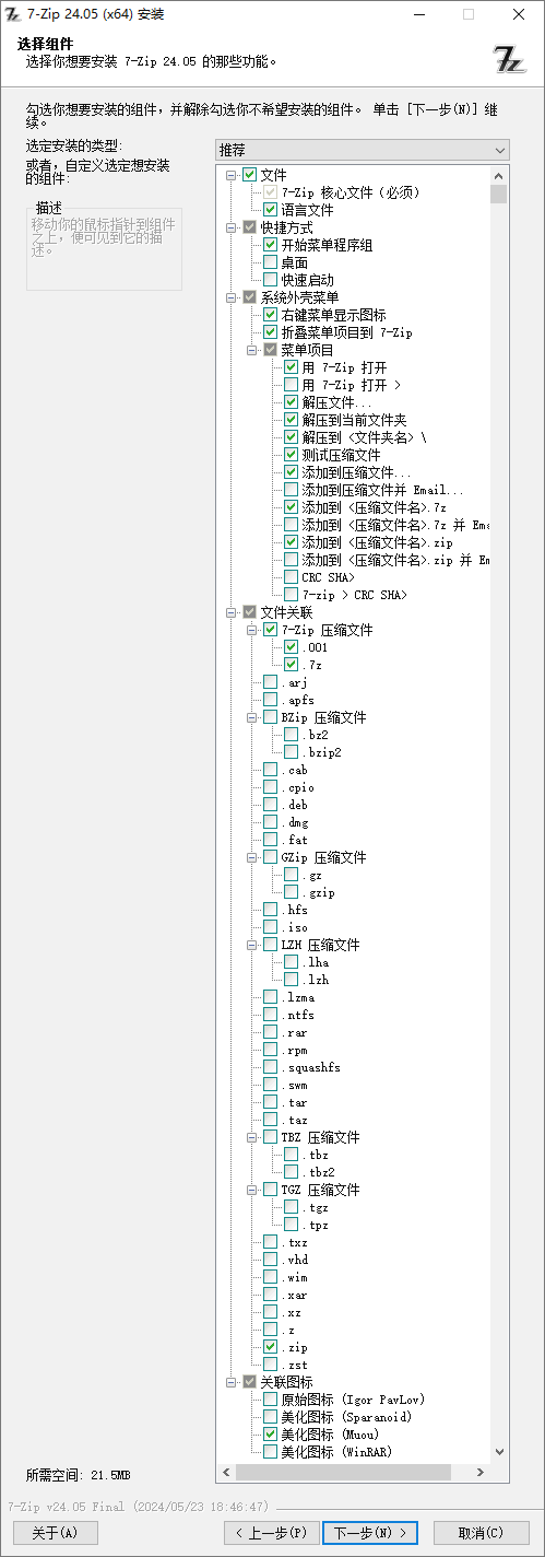 安装包中附带 7-Zip 官方简体中文作者 Sparanoid 和 Muou 制作的美化图标组。如果之前关联使用的是 7-Zip 原作者 (Igor Pavlov) 的图标,则美化图标将在系统重启后才能生效;反之亦需重启系统方可生效。