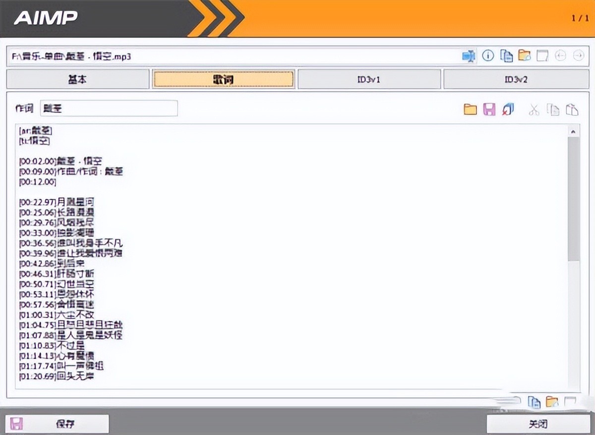1、AIMP播放器支持并优先显示标签中的内嵌歌词,标签中的内嵌歌词可在【文件信息】窗口(F4)中的【歌词】选项卡中编辑与查看。