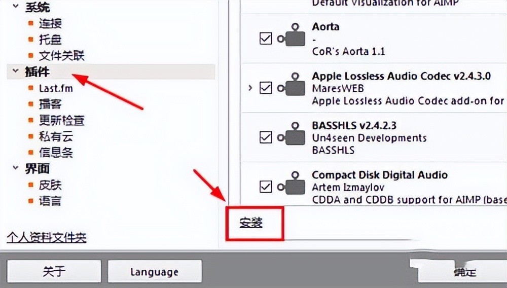 2、AIMP的插件支持ZIP文件或aimppack文件,选择后即可导入安装,你可以在插件列表中确认插件是否启用。你也可以点击获取更多插件,去官网下载插件。