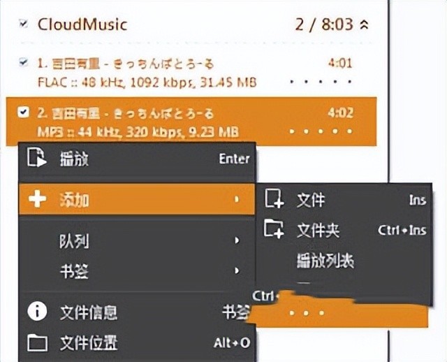 首先打开播放器,下方的资源列表中从左到右分别为播放列表分组,当前播放列表,文件列表。你只需在右边的列表中右键,在菜单中选择【添加】-【添加文件】或文件夹,然后将音乐添加进来即可。