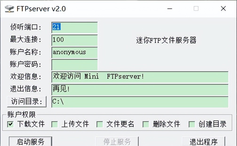 FTPserver是一款免费的、绿色的(无需安装,只有一个文件)、小巧的(59KB)的FTP服务器软件。您可以轻松地将它放在U盘里,邮箱里,网盘里,这样,您就有了一个可以随身携带的FTP服务器软件。
