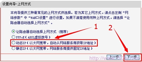 A、选择“动态IP(以太网宽带,自动从网络服务商获取IP地址)”——>点击“下一步”,会跳转到第4步。