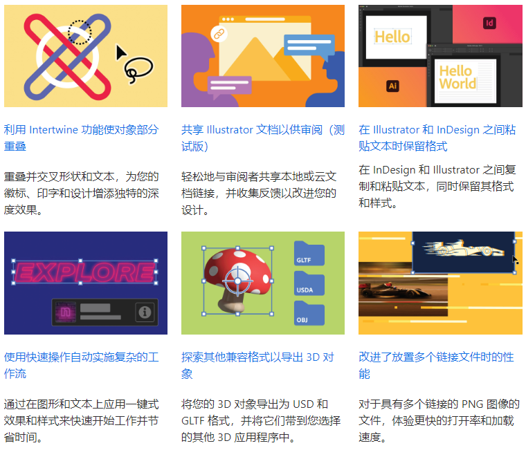 Illustrator 2023新功能带来了,利用 Intertwine 功能使对象部分重叠、共享 Illustrator 文档以供审阅(测试版)、在 Illustrator 和 InDesign 之间粘贴文本时保留格式、使用快速操作自动实施复杂的工作流、探索其他兼容格式以导出 3D 对象、改进了放置多个链接文件时的性能。