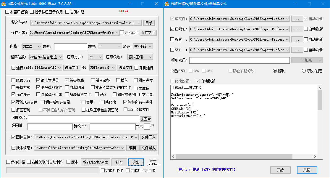 - 作者:JexChan(老五)全新的自解压内核,非现有的7zSFX、WinRAR、ZLIB自解压模块;采用先进的打包方式(堪称黑科技—>内核默认PECMD自解压模块)7zSFX模块,创建的单文件支持传递参数(包含内置参数和外置参数)7zSFX模块也可插入程序,创建快捷方式,界面比其它同类工具更加操作方便;7zSFX制作的单文件也可以解压前手动选择解压路径了 (勾选解压路径进行设置)7zSFX提取页面支持修改创建、编辑7zSFX配置文件、单独替换SFX、配置、压缩包;PECMD模块可将单个WCS打包成单文件(直接拖入)可不释放临时文件在内存中运行。可传递参数,内置参数、外置参数均支持,这是其它单文件制作程序无法达到的高度;支持打包exe、bat、cmd、vbs、wcs,并且运行WCS时无需额外准备PECMD.exe。可选保护模式,即“防修改补丁”,防止7z、Winrar等软件右键打开;7zSFX模块也可以对程序位数x86、x64自适应;支持加壳UPX压缩、mpress压缩,以减小体积;压缩包可加密码;可带解压密码运行,免输入;可设置开机启动;何为传递外置参数?