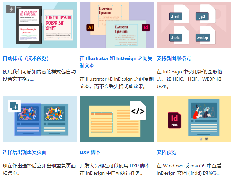InDesign 2023 带来的新功能包括有:自动样式、在 Illustrator 和 InDesign 之间复制文本、支持新图形格式、选择后出现重复页面、UXP 脚本、文档预览。