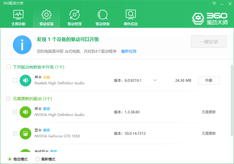 360驱动大师,驱动安装更新软件,百万级的驱动库,驱动安装和升级一键化,无需手动操作;首创驱动体检技术,驱动精确识别匹配;支持无人值守安装驱动,启动参数-q;首创一键智能识别假显卡、假硬件。