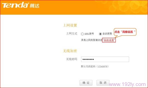 在浏览器地址栏中输入:192.168.0.1并按下回车——>输入默认登录密码:admin——>点击“确定”。(如果192.168.0.1打不开,请阅读文章:腾达(Tenda)无线路由器192.168.0.1打不开的解决办法)