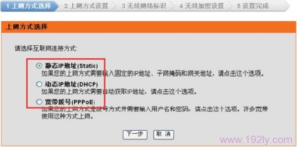 在“上网方式选择”选项下有:静态IP地址(Static)、动态IP地址(DHCP)、宽带拨号(PPPoE)?3个选项。其实,上网方式是根据用户办理的宽带业务类型来决定的,下面进行详细介绍说明。