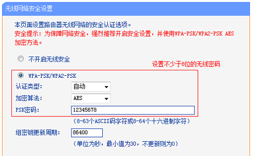 “PSK密码”,指的就是TL-WR886N的无线网络密码,建议用大写字母+小写字母+数字+符号组合来设置,且密码长度不得小于8位。