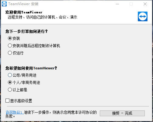 2、双击文件“TeamViewer_Setup.exe”安装原程序,安装时选择个人/非商务用途;