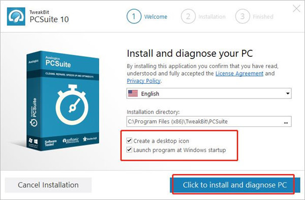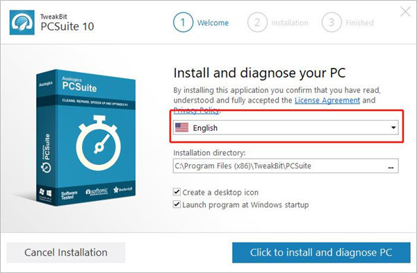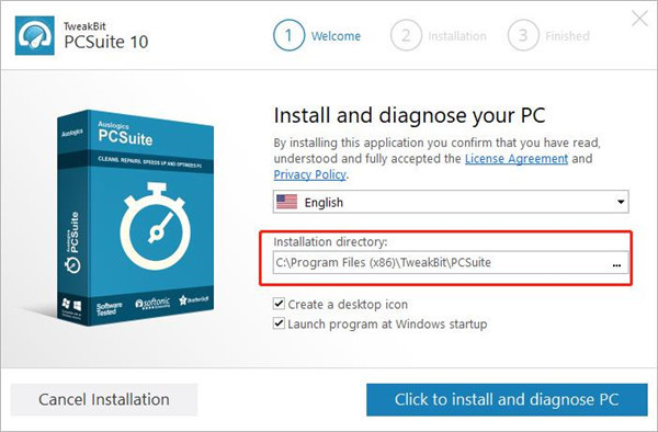 安装向导默认设置的软件默认安装路径为C:\Program Files (x86)\TweakBit\PCSuite