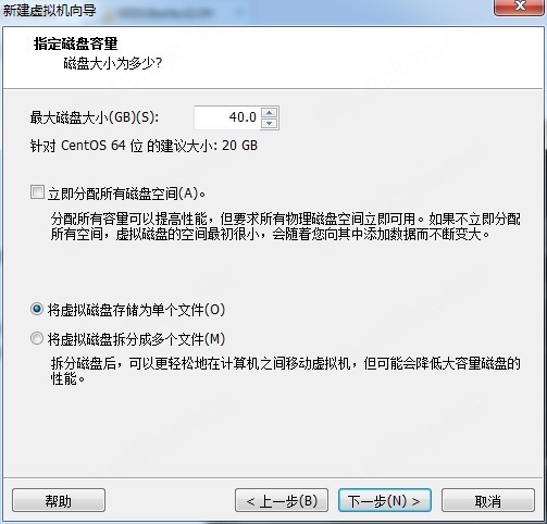 11、现在我们指定磁盘容量,将虚拟磁盘存储为单个文件