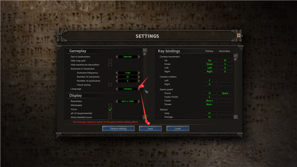 3.进入设置界面,找到language(语言),切换到Chinese(中文),再点击save,重启游戏进入即是中文