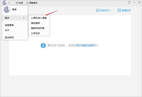 2、点击头像,选择更多_上课ID进入课堂,输入老师课堂ID进入课堂,进入课堂后就可以开始学习了