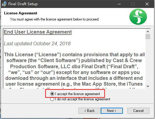 2、首先点击“FinalDraftSetup.msi”安装新版客户端程序,阅读并同意软件安装协议